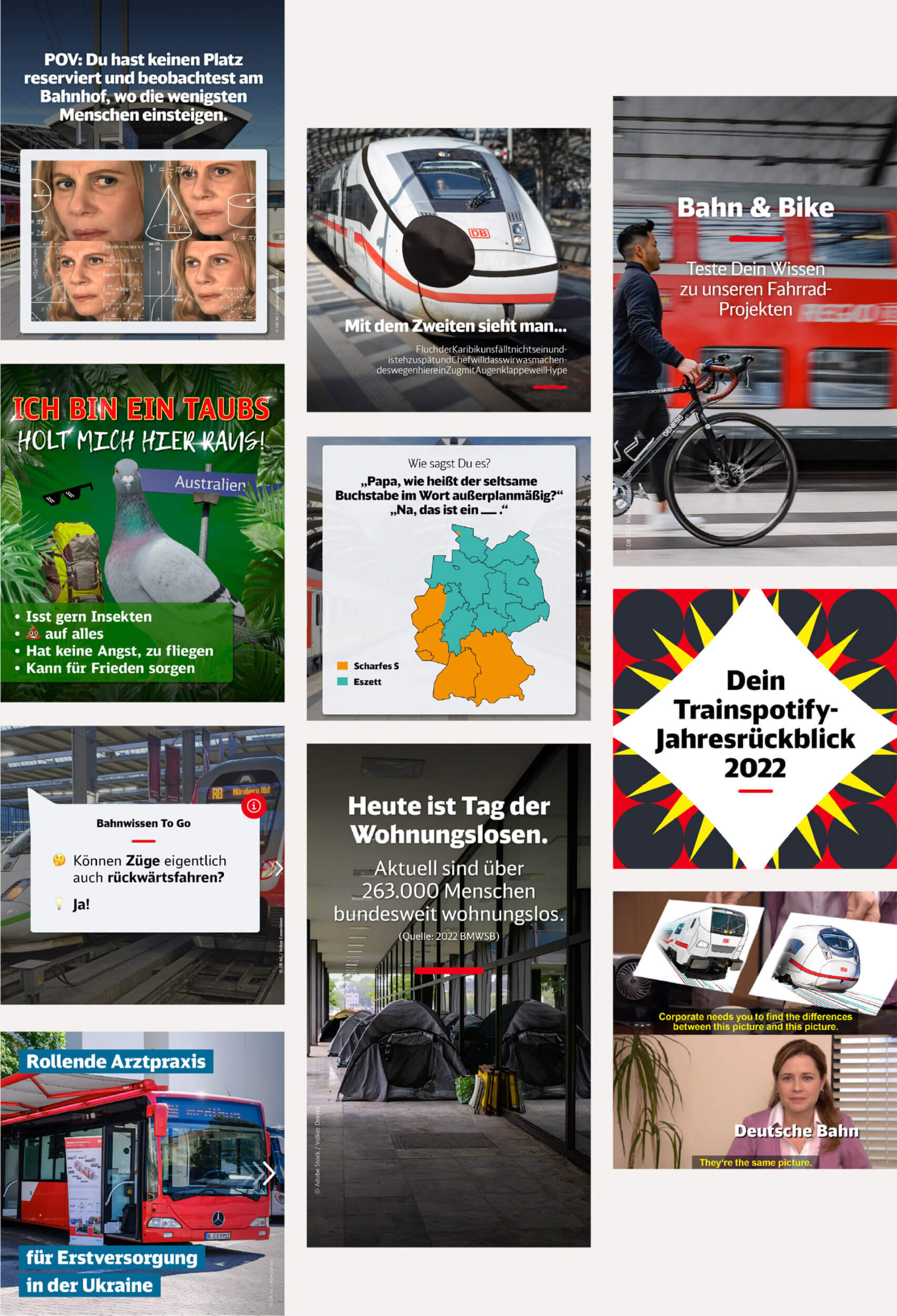 In enger Zusammenarbeit mit dem SocialMedia Team der DB werden regelmäßig Inhalte für die Social Media Kanäle der DB erstellt. U. a. für Facebook, Instagram, Twitter und LinkedIn.